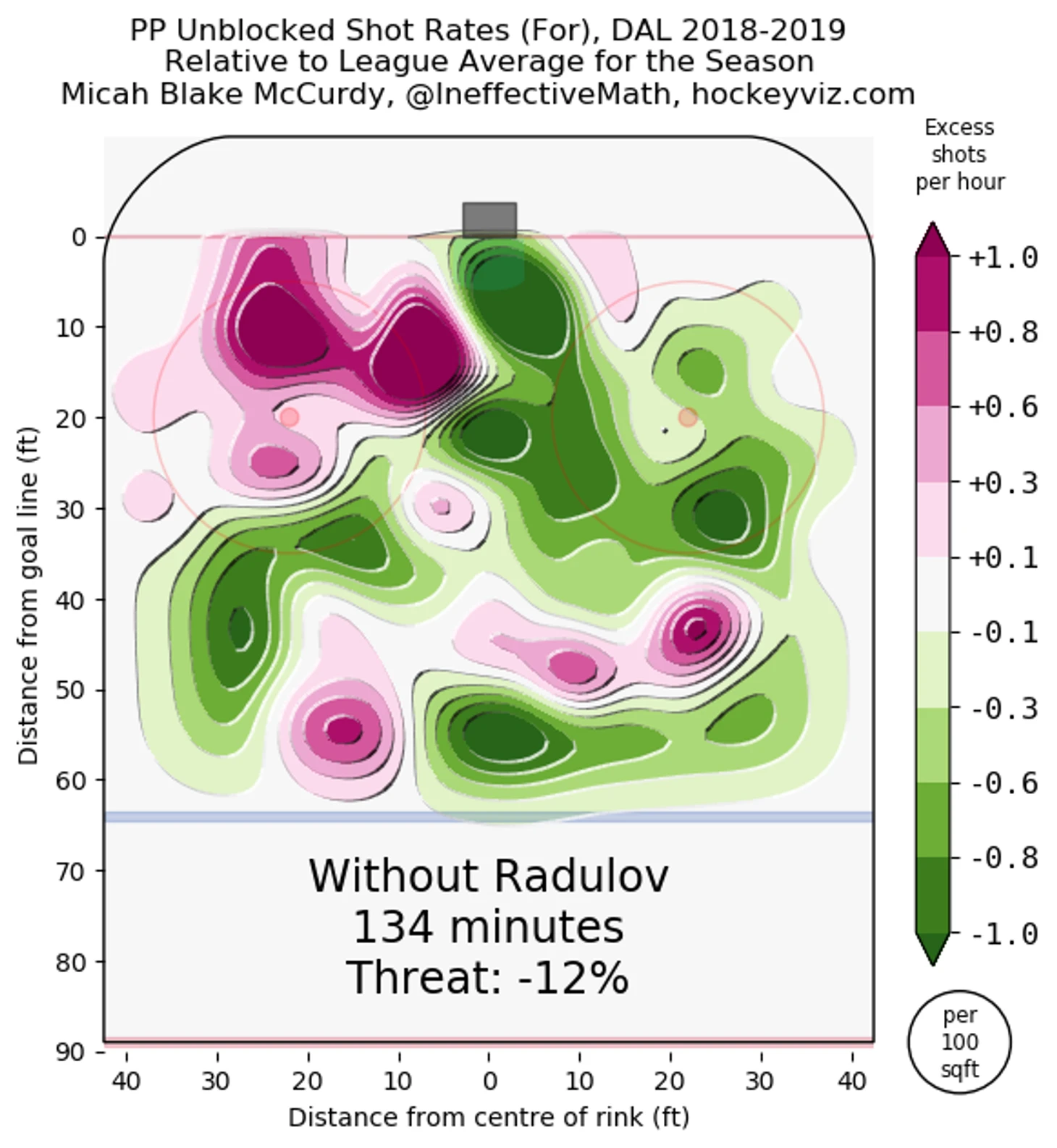 Без него очень сложно представить большинство «Далласа», которое, кстати, даже лучше, чем у «Вашингтона». Вот тепловая карта бросков в большинстве с участием Радулова: