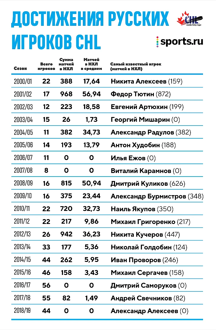 Минимум 100 матчей во взрослых лигах провели 89 русских игроков, которые в разное время выступали в CHL. Хоккеистов, которые не добрались даже до этой отметки, – 53, почти половина из них завершила карьеру сразу после ухода из юниорских лиг. Остальные играли в североамериканских минорках или небольших европейских лигах (Дания, вторые дивизионы Чехии и Германии), некоторые даже смогли сыграть десяток матчей в ВХЛ.