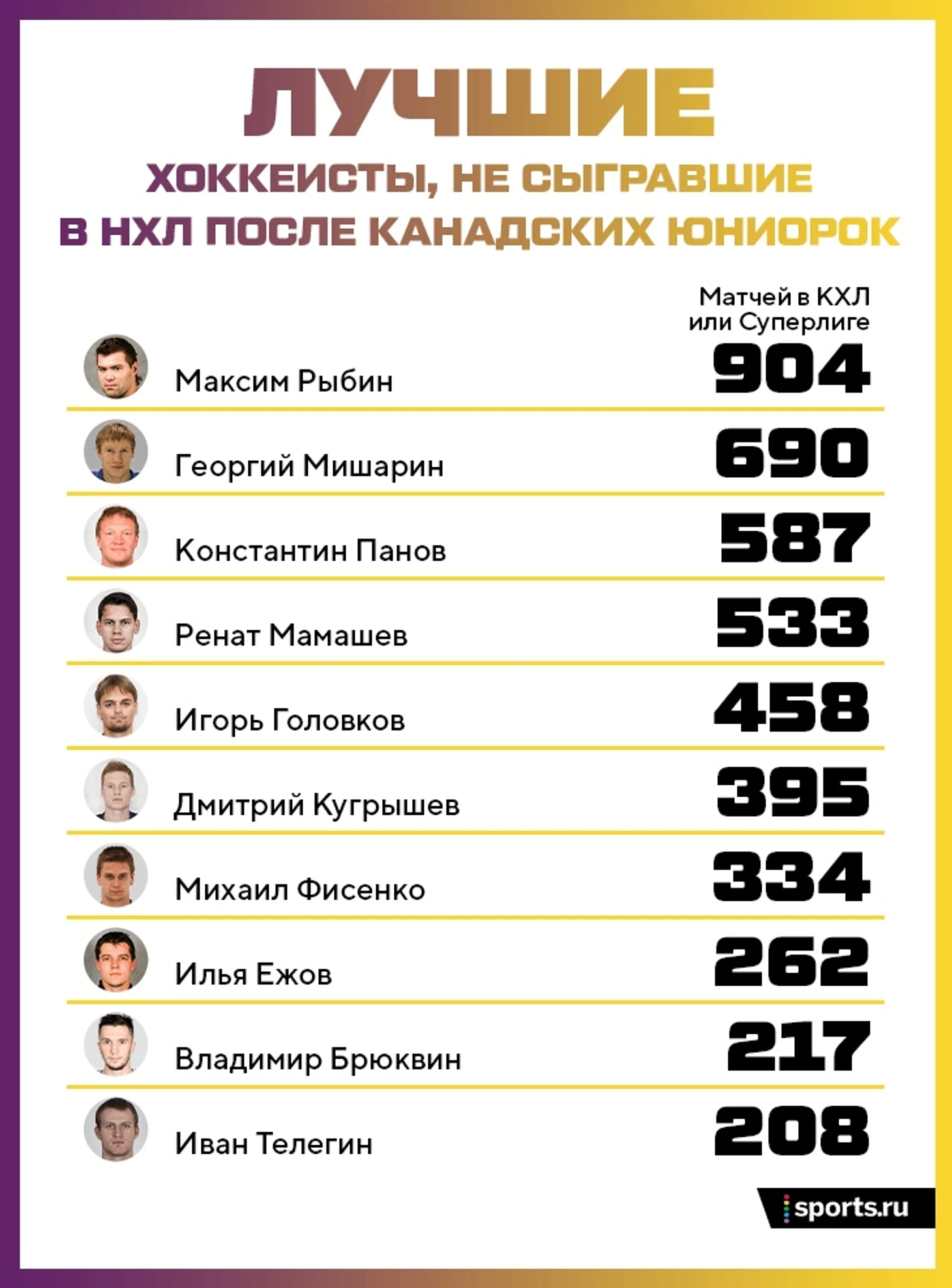 Но оценивать успех наших юниоров в Канаде только по НХЛ не слишком справедливо – это элитная лига для лучших хоккеистов. Более объективным критерием будет просто игра на профессиональном уровне – разумеется, без учета чемпионата Румынии или минорных лиг Северной Америки: в зачет пойдут 100 матчей суперлиги, ВХЛ, КХЛ, АХЛ или европейской лиги из топ-4.