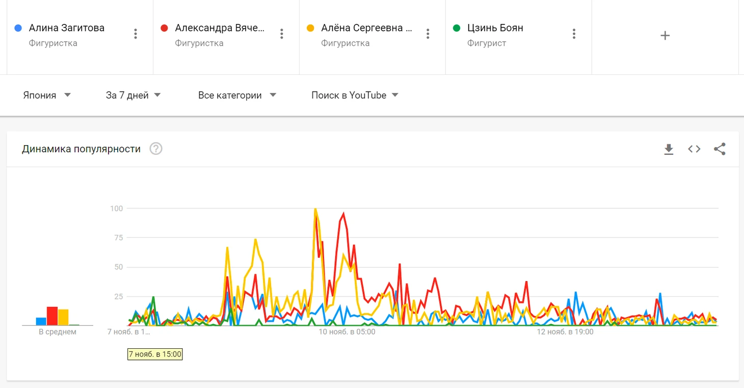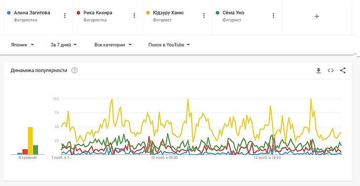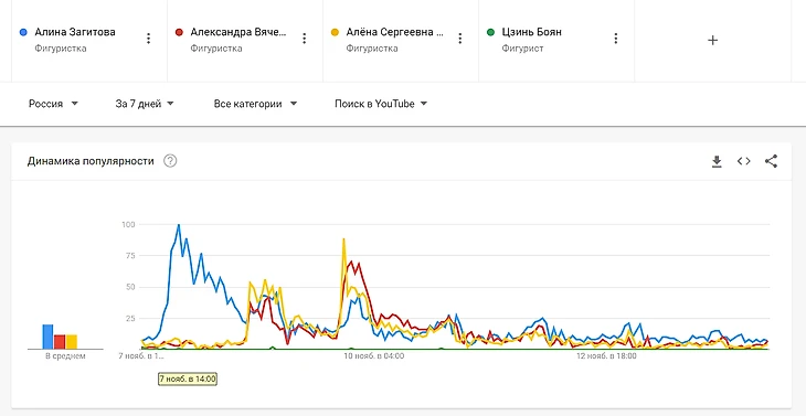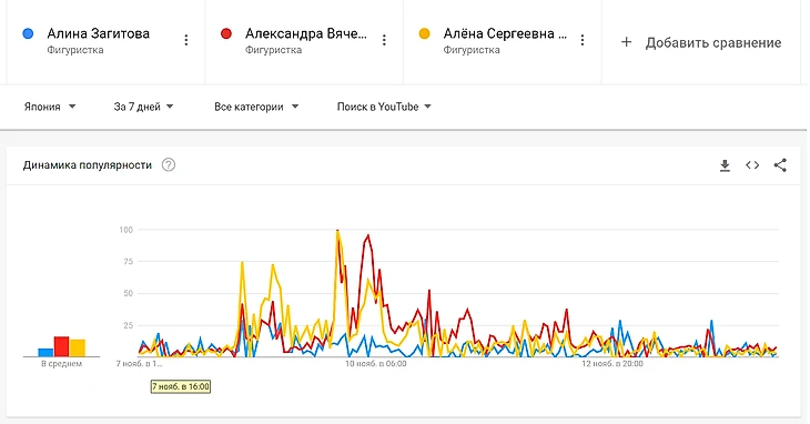 График ниже показывает динамику поиска видео с выступлениями фигуристов на YouTube, начиная с 7 ноября 2020 года. Прямая ссылка на график.