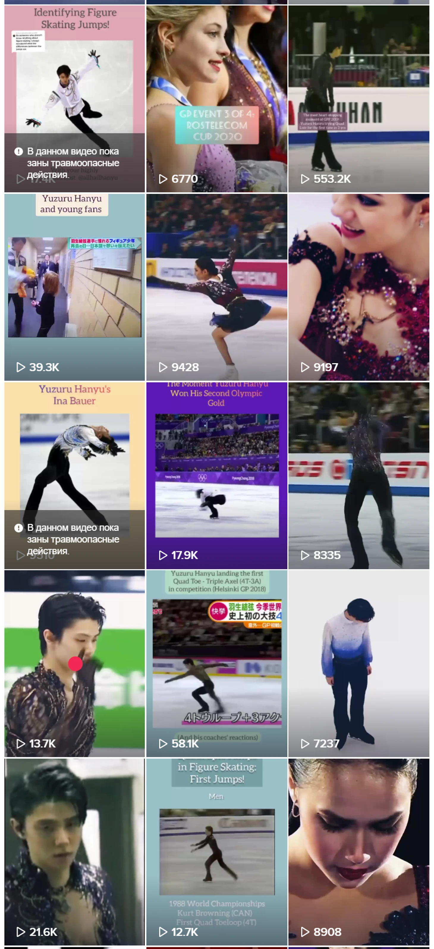 А теперь посмотрим немножко на активность данного аккаунта. Как можно догадаться, это аккаунт болельщика Юзуру, который также немного интересуется и другими видами/персонами в фк. На скриншоте ниже вы можете найти Алину Загитову, Женю Медведеву и видео с церемонии награждения женщин на Капе 2020: