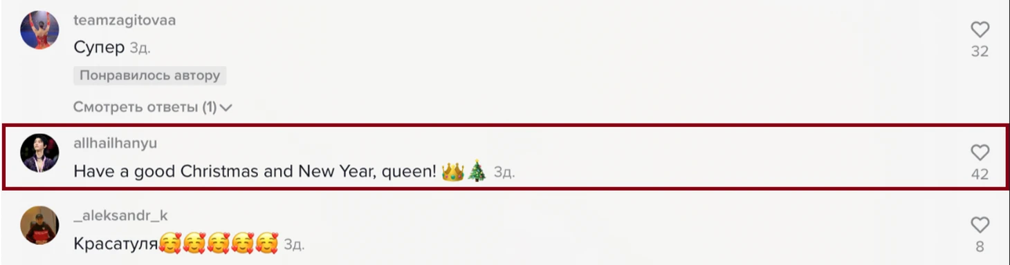 "Отдельно стоит отметить, что под данным постом с наступающими праздниками 18-летнюю Загитову поздравил лидер сборной Японии по фигурному катанию Юдзуру Ханю. - Хорошего Рождества и Нового года, королева, - написал Ханю."