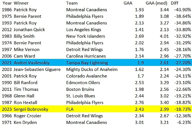 4) Самый молодой обладатель награды - Патрик Руа (1986 - 20 лет). Самый возрастной - Тим Томас (2011 - 36 лет). Самая молодой вратарь относительно среднего возраста других - Роже Крозье (1966 - 23 года), средний возраст других вратарей в тот год составлял почти 34 года