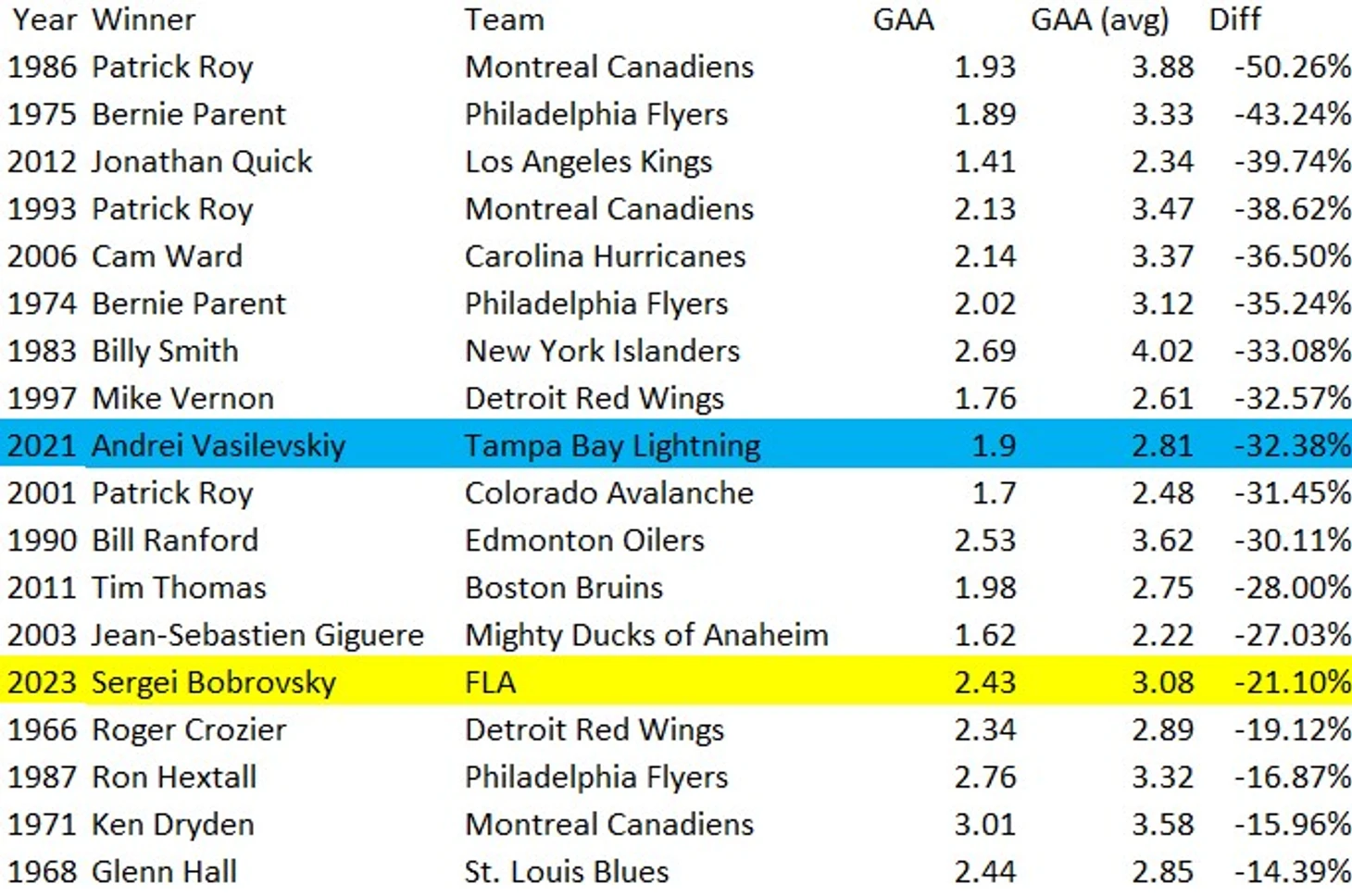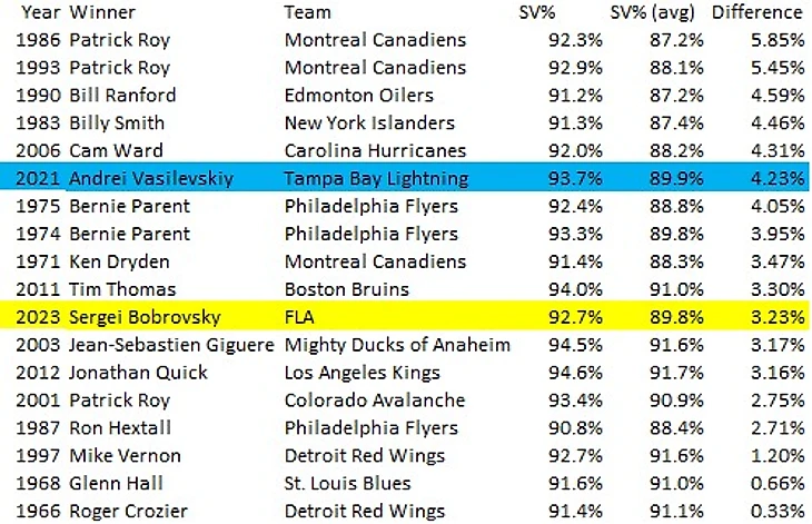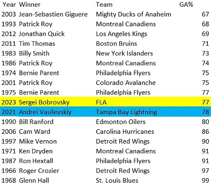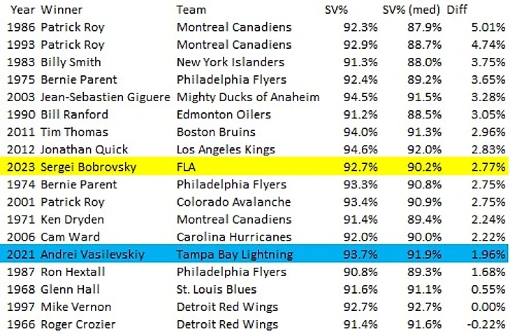 Сергей Бобровский получал много критики в свой адрес в последние годы. Сейчас его команда играет в финале конференции, а самого Сергея многие считают одним из главных факторов успешного выступления пантер. Если Флорида возьмет Кубок Стенли, то у российского вратаря (в случае дальнейшего успешного выступления) будут высокие шансы на Конн Смайт Трофи - приз лучшему игроку плей-офф. Сегодня я хотел бы вспомнить всех вратарей, которые брали данный приз, и сравнить их результаты.