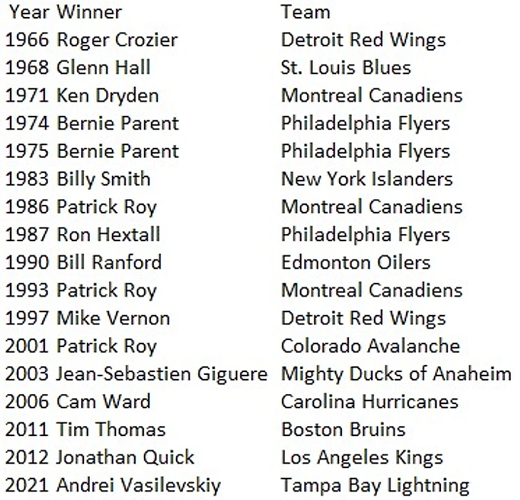 3) Все вратари, кроме Патрика Руа и Берни Парента, брали Конн Смайт 1 раз. Патрик брал данный приз 3 раза (1986, 1993, 2001). Берни 2 раза (1974, 1975)
