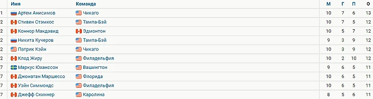 Русские форварды «Чикаго» набрали во встрече с «Калгари» по 2 (1+1) очка. Теперь у Панарина в этом сезоне 10 (4+6) баллов в 10 играх, а у Анисимова – 13 (7+6) – и после этой игры Артем возглавил таблицы бомбардиров и снайперов НХЛ (в гонке снайперов он делит первое место со Стэмкосом).
