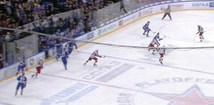 В середине матча хоккестам СКА удалась быстра атака – Каблуков сделал передачу на Коскиранту, и финн отправил шайбу между щитков Сорокина – 2:0.