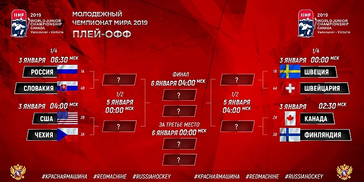 19.04 Наш матч – последний в новом игровом дне. До нас сыграют Швеция – Швейцария (0.00 мск), Канада – Финляндия (2.30 мск), США – Чехия (4.00 мск). Вот полная сетка плей-офф: