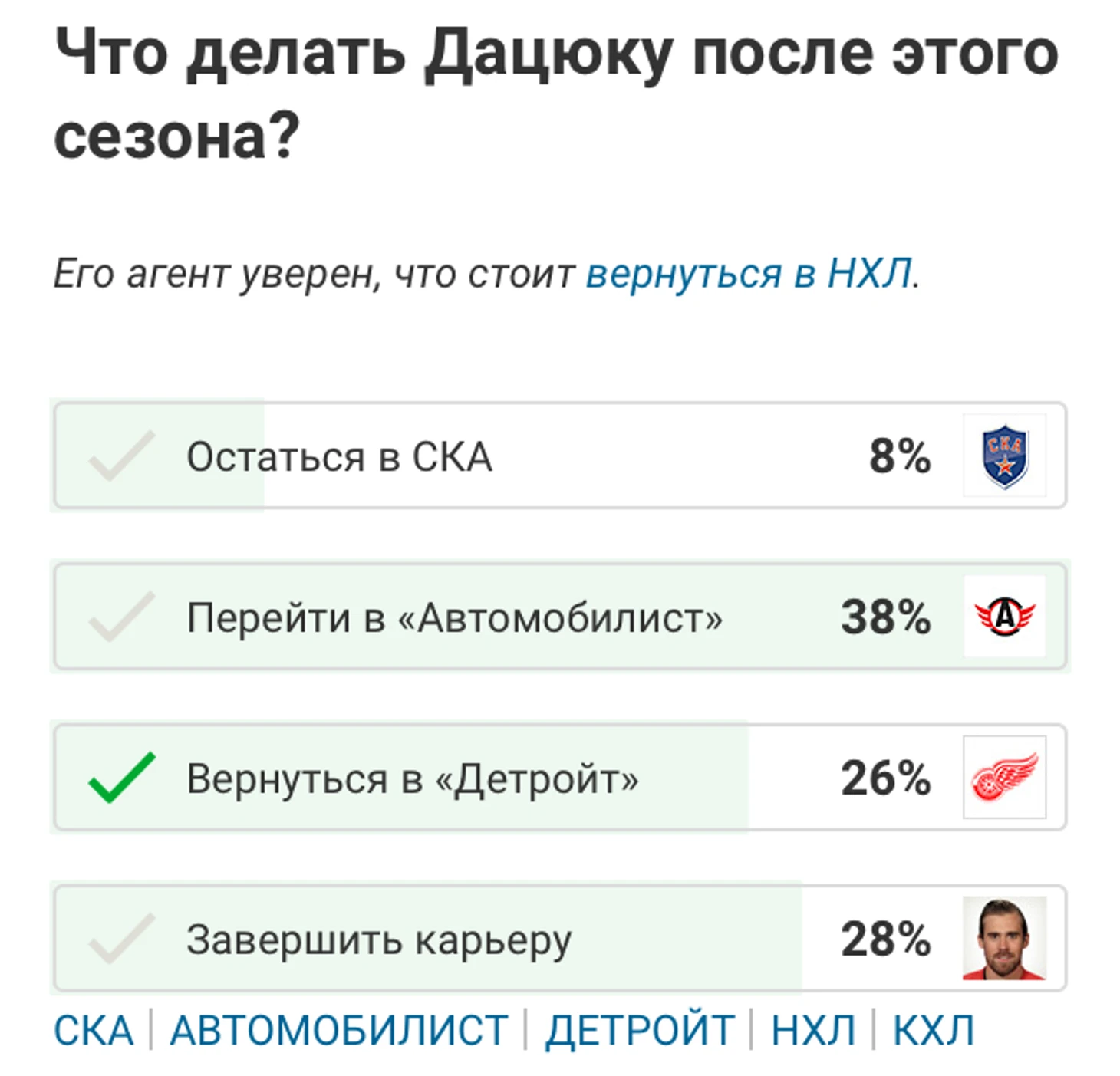 А вот что думают пользователи Трибуны о будущем Павла. 38% считают, что Дацюку нужно перейти в «Автомобилист», 28% — завершить карьеру. Вариант с возвращением в «Детройт» понравился 26% пользователей.