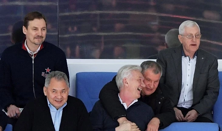 Для тех, кто не узнал, на всякий случай (слева направо): министр обороны Сергей Шойгу, главный исполнительный директор «Роснефти» (основной спонсор ЦСКА) Игорь Сечин и владелец инвестиционной группы Volga Group, председатель Совета директоров КХЛ и президент СКА Геннадий Тимченко.