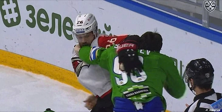 «Салават»выпустил на лед прежде не игравшего в матче Даниила Скорикова, который схватился с Семеном Кошелевым, а Эдуард Гиматов прыгнул на Михаила Фисенко. Алексей Семенов взял себе в соперники Никиту Пивцакина, а Елизаров, Кадейкин и Чудинов решили обойтись без драки. Скориков уехал со льда с кровью на визоре.