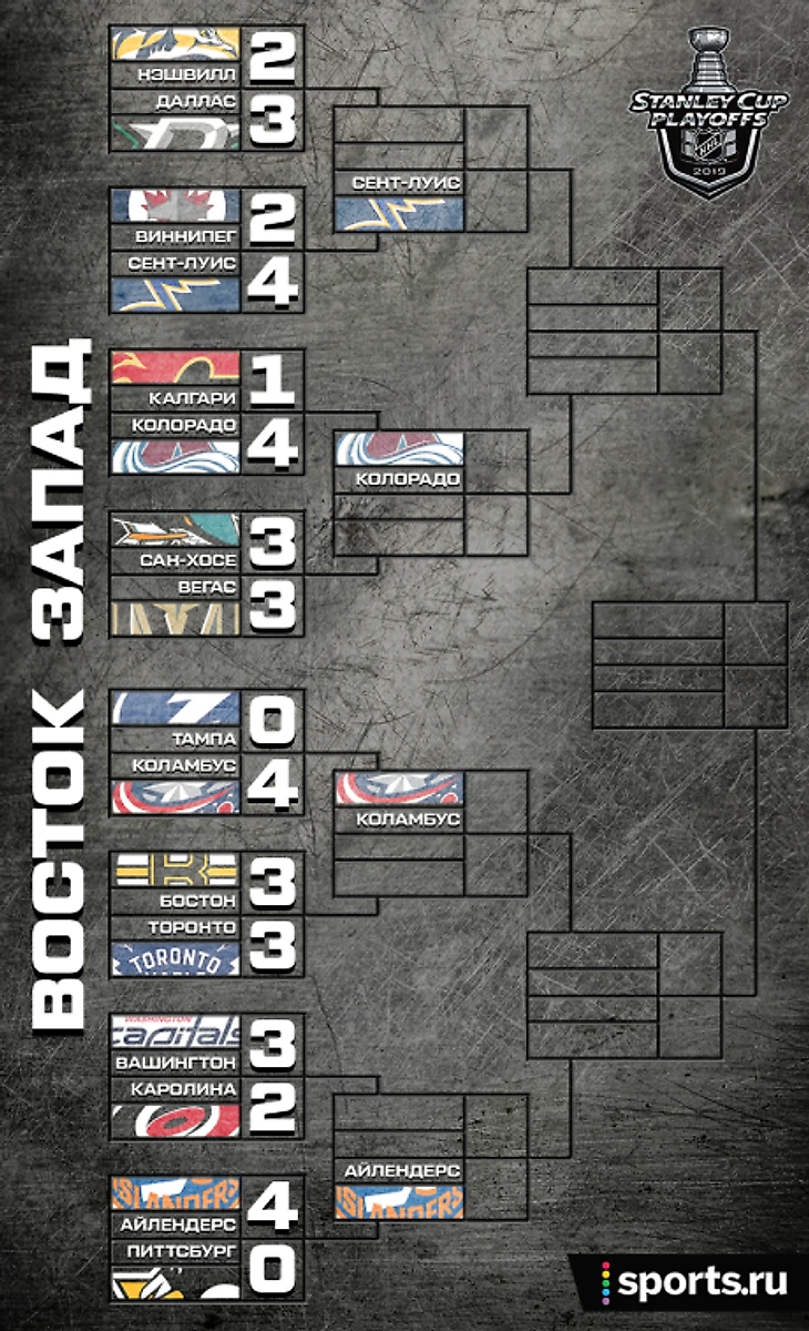 «Коламбус» и «Колорадо» все никак не дождутся соперников по второму раунду: «Бостон» с «Торонто» и «Сан-Хосе» с «Вегасом» до сих пор не определили лучших в своих парах, и, кажется, бесполезно угадывать, кто пройдет дальше.