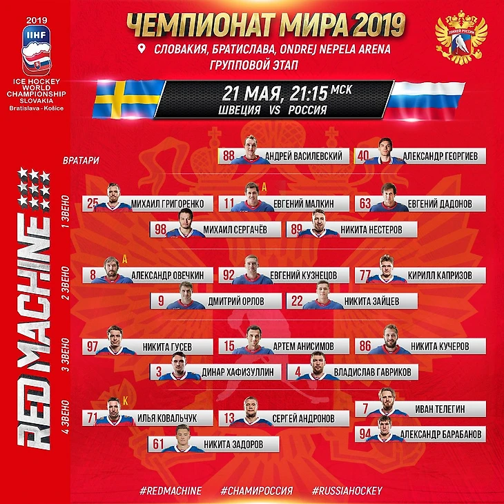 20:15 Час до матча. Появился состав сборной России. У полевых ничего нового, а в воротах – Василевский.