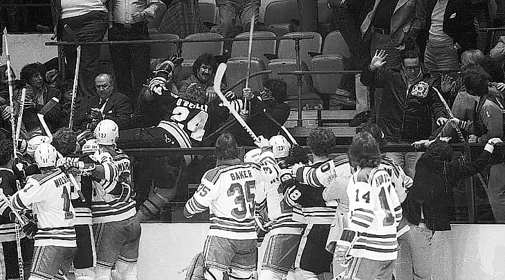Еще одно напоминание, что не стоит мешать хоккеистам делать их работу. Матчи двух команд «Оригинальной шестерки» известны яркими стычками – такая случилась и в 1979-м.