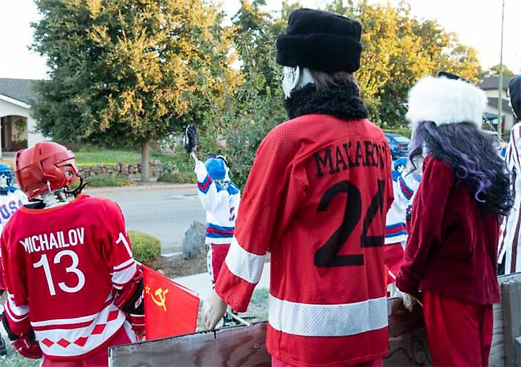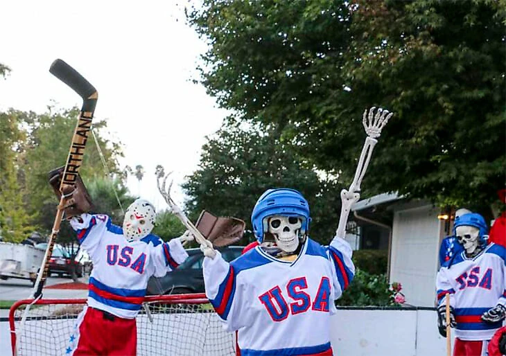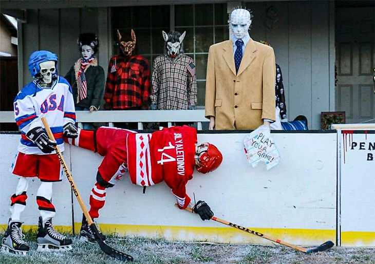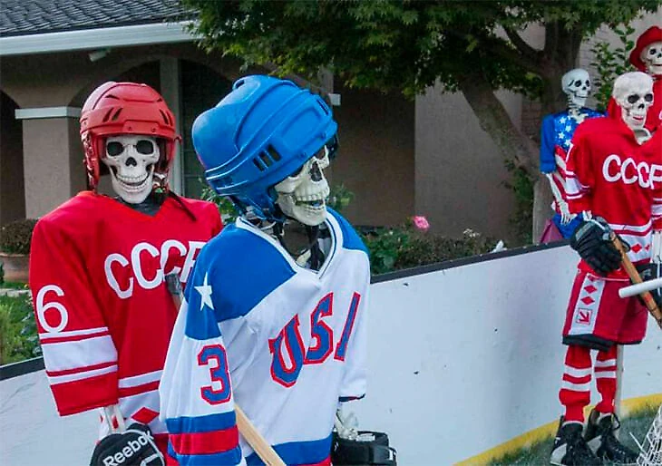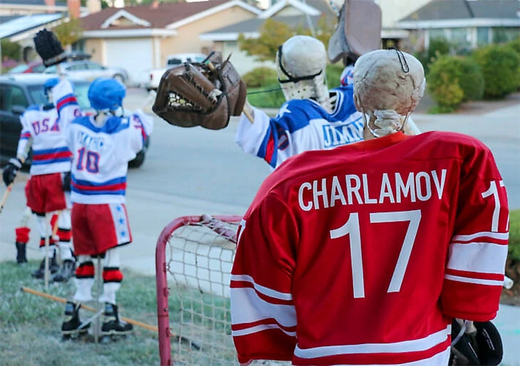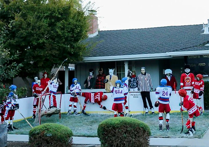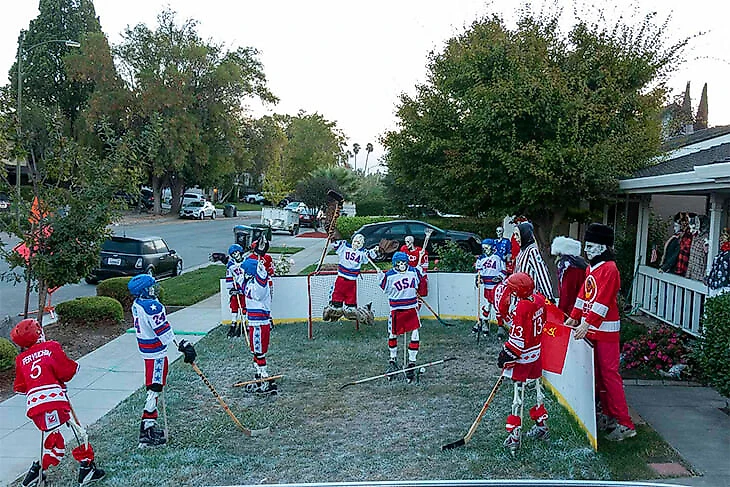 Хэллоуин-2020, несмотря на коронавирус, тоже подарил отличный хоккейный перфоманс. Фанатка «Сан-Хосе» Энн Эйкхорн воссоздала в своем дворе сцену из матча между сборными СССР и США на Олимпиаде в Лейк-Плэсиде, который завершился сенсационной победой американцев и вошел в историю под названием «Чудо на льду».