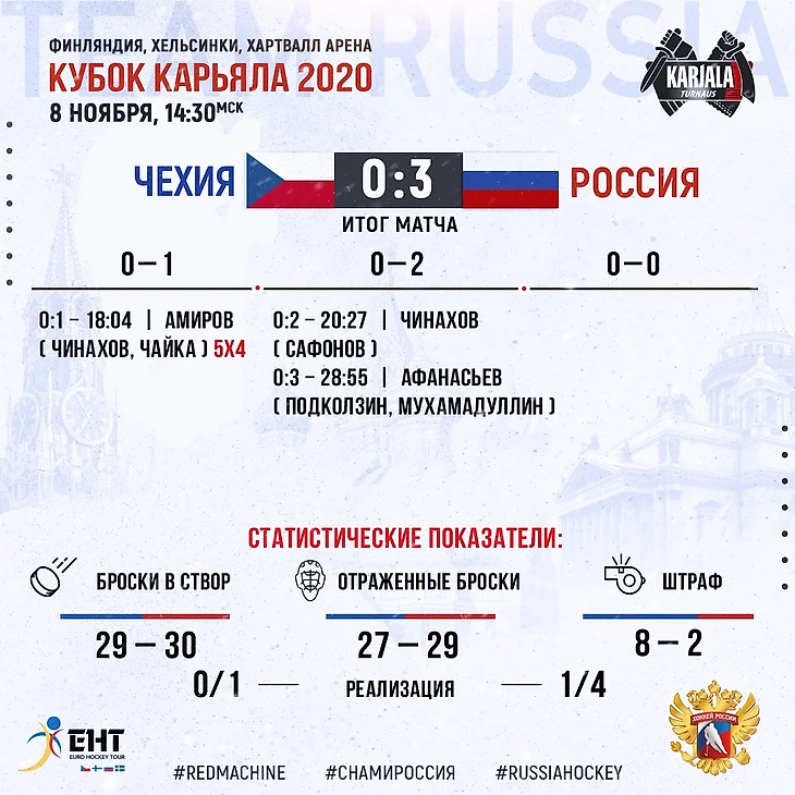Поэтому у нас не было преимущества, и в целом матч не выглядел прям нашим. Но Россия на Кубке «Карьялы» в такой ситуации, что и ничья по игре – это наша победа; а с учетом того, что сохранили стиль, что работали над атакой – чередуя выходы в несколько передач с резкими выстрелами под чужую синюю (в пропорции где-то 4 к 1), что создавали моменты – это была однозначная победа», – почитайте колонку по матчу от Никиты Петухова, если еще не видели ее.