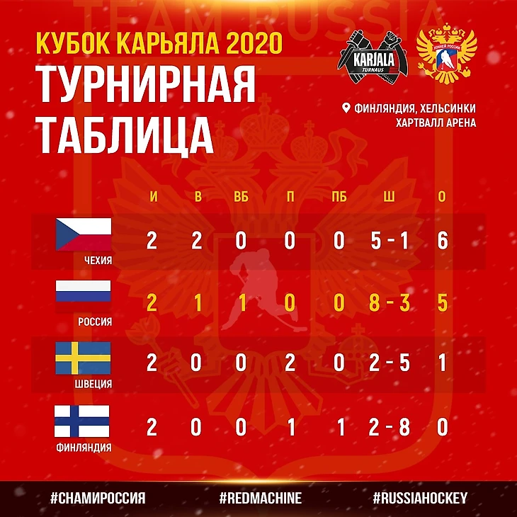 12:30 Вот так выглядит таблица Кубка «Карьялы» прямо сейчас. Для победы в турнире российской молодежке надо просто выиграть – хоть в основное, хоть в овертайме, хоть по буллитам.