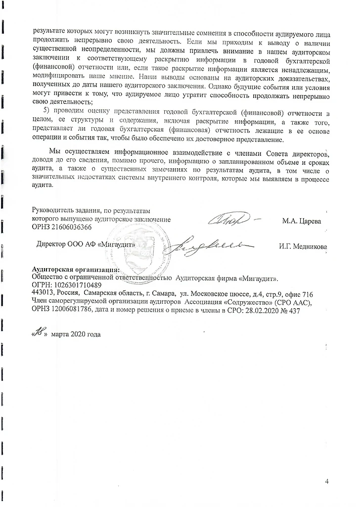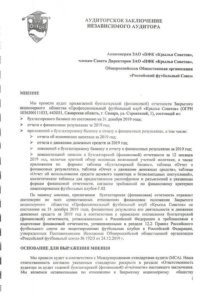 По нашему мнению, прилагаемая бухгалтерская (финансовая) отчетность отражает достоверно во всех существенных отношениях финансовое положение Закрытого акционерного общества «Профессиональный футбольный клуб «Крылья Советов» по состоянию на 31 декабря 2019 года, финансовые результаты его деятельности и движение денежных средств за 2019 год в соответствии с правилами составления бухгалтерской (финансовой) отчетности, установленными в Российской Федерации и требованиями к подготовке финансовой отчетности, установленными в разделе 12.2 Правил Российского футбольного союза по лицензированию футбольных клубов в Российской Федерации, утвержденных Постановлением Исполкома Общероссийской общественной организации «Российский футбольный союз» № 192/5 от 24.12.2019 г.