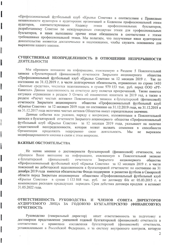 Мы обращаем внимание на информацию, изложенную в Разделе 5 Пояснительной записке к бухгалтерской (финансовой) отчетности Закрытого акционерного общества «Профессиональный футбольный клуб «Крылья Советов» за 12 месяцев 2019 г. Так по состоянию на 31.12.2019 г. в части долгосрочных обязательств, отраженных по строке 1410 «Заемные средства», числится задолженность в сумме 979 153 тыс. руб. перед ООО «РТ- Капитал». Данная задолженность па отчетную дату является просроченной. Также имеется ситуация отраженная в разделе 3 Отчета об изменениях капитала за 2019 год, а также в разделе «Расчет чистых активов» Пояснительной записки к бухгалтерской (финансовой) отчетности Закрытого акционерного общества «Профессиональный футбольный клуб «Крылья Советов» за 12 месяцев 2019 года: по состоянию на 31.12.2019 года, на 31.12.2018 и на 31.12.2017 года величина чистых активов Общества имеет отрицательное значение.