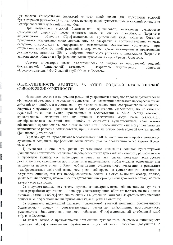 При подготовке годовой бухгалтерской (финансовой) отчетности руководство (генеральный директор) несет ответственность за оценку способности Закрытого акционерного общества «Профессиональный футбольный клуб «Крылья Советов» продолжать непрерывно свою деятельность, за раскрытие в соответствующих случаях сведений, относящихся к непрерывности деятельности. Исключение составляет, при отсутствии какой-либо иной реальной альтернативы, кроме ликвидации и прекращения деятельности, принятие Общим собрание акционеров решения о ликвидации Закрытого акционерного общества «Профессиональный футбольный клуб «Крылья Советов»,
