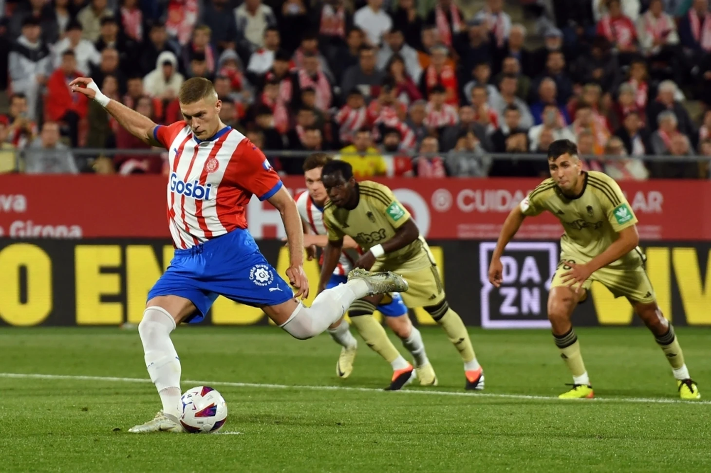 «Эспаньол», покинувший высшую лигу годом ранее, оставил лишь 2 команды из Каталонии, временно превращая противостояние «Жироны» с «Барселоной» в дерби всея региона. В первой из встреч команда Мичела приезжала на временный стадион «сине-гранатовых», переживающих позднюю стадию руководства Хави. Уже на 12' Довбик расстрелял Иньяки Пенью с передачи Цыганкова, убежавшего в отрыв от ошибившегося противника, на что Роберт Левандовски уже на 19' ответил голом с углового, перепрыгнув 34-летнего воспитанника «Эспаньола» Виктора Лопеса, еще одного крайне созидательного центрдефа «красно-белых». При большом количестве моментов у каждой из сторон в первом тайме (1,89 vs 1 по xG) «Жирона» оказалась более удачливой, что подтвердил Мигель Гутьеррес, на 40' протащивший мяч через несколько игроков «Барсы» и выстреливший шведой в ближнюю девятку с линии штрафной.
