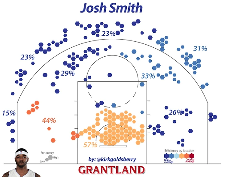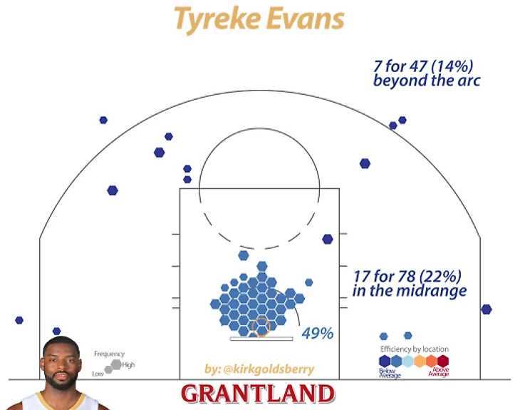 Кстати говоря, я бы хотел видеть Тайрика в качестве вносящего импульс со скамейки игрока, если бы он получал столько же, сколько Джамал Кроуфорд (5-6 миллионов в год). Но почти вдвое больше? Недоступно моему разуму. Он напоминает мне Кори Мэггетти – в течение 10 лет Кори зарабатывал слишком много, никогда никому не помог, никогда не выступал за приличную команду и всегда оставлял у вас чувство разочарованности, так как время от времени выдавал совершенно монструозные игры (35 очков, 15 из 17 штрафных), напоминая, насколько же он талантлив. Таков и Тайрик. Он Мэггетти 2.0. Вот объяснения от Кирка Голдсберри: «Из 203 игроков, которые совершили минимум 75 бросков со средней дистанции, Эванс показал худший процент попадания с игры – 22. Перед ним – Коди Зеллер с 27 процентами – это огромная разница. Также он попадает лишь 14 процентов своих трехочковых». Если не считать всего этого, то он в огне.