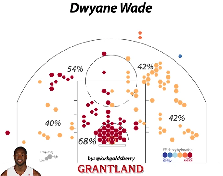 В этих цифрах я вижу 32-летнего баскетболиста, который играет за счет джампшотов, не выходит на линию и так и не научился бросать из-за дуги. Он остался эффективным благодаря трем вещам: сыгранности («Майами» уже 4-й год играет одним костяком), ЛеБрону (дает всем возможность совершать легкие броски) и умному тренеру (который выделяет его на протяжении всего сезона). Хорошая новость для Уэйда: карта бросков показывает иную картину: