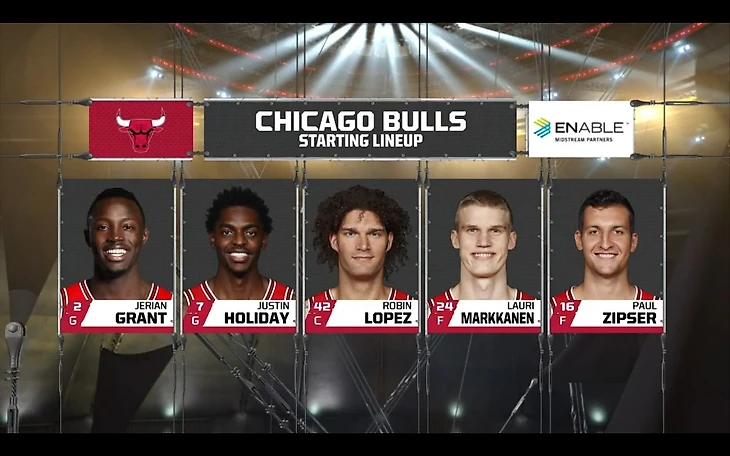 Сюрпризов в стартовом составе не было, разве что вернувшийся немец улыбался с фото, вместо Валентина. Грант вышел первым номером, Холидэй – вторым, Зип занял место 3 номера, на 4 вышел Лаури и центром стал незаменимый РоЛо. В Оклахоме все предсказуемо: Расс – Роберсон – Кармело – Джордж – Адамс. Поехали.