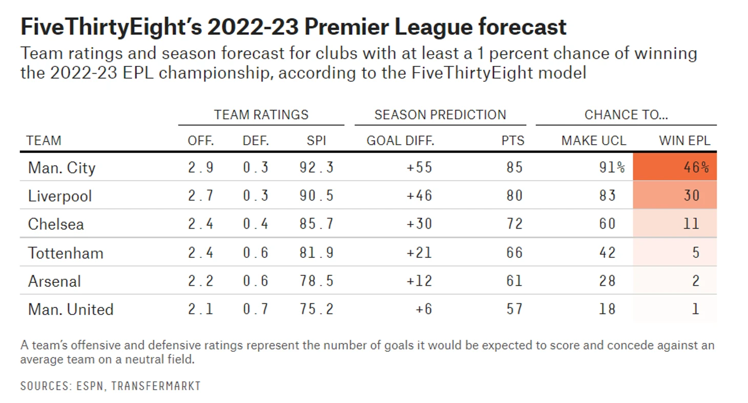 А вот известный портал FiveThirtyEight, который собирает разные алгоритмы для своих прогнозов, наоборот видит «Челси» в тройке, а «МЮ» всего лишь на 6 месте. Чемпионом же, как и в случае с машиной talkSPORT, назван «Сити».