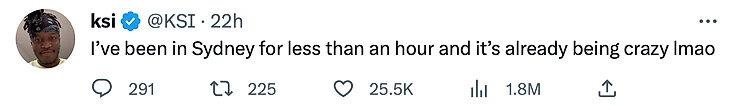 KSI написал в Твиттере: «Я был в Сиднее меньше часа, и это уже безумие, Lol».