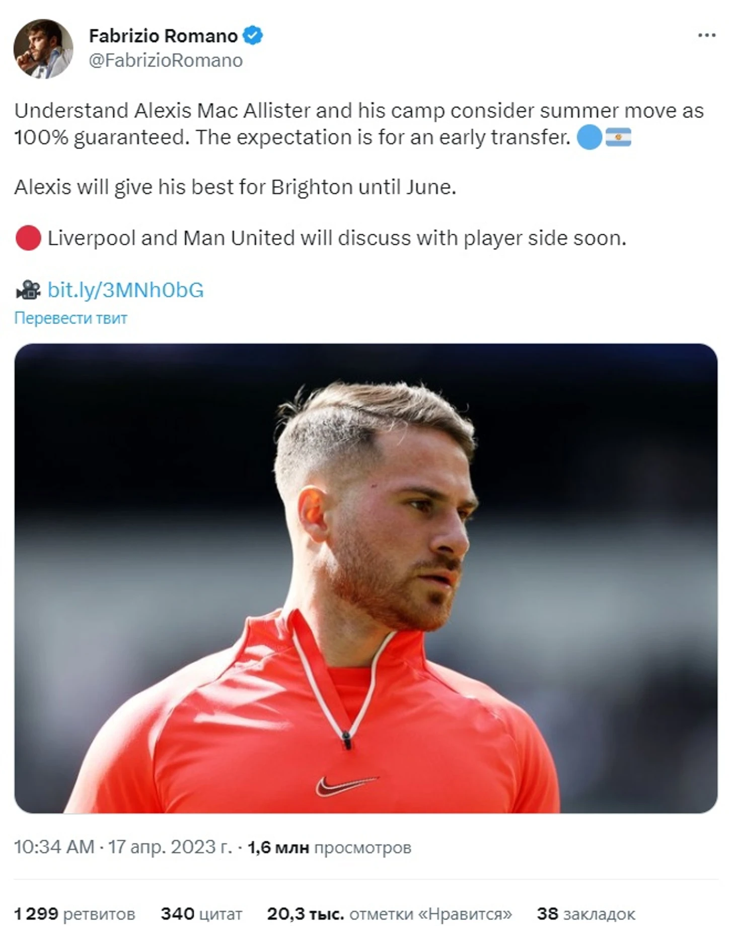 Теперь Мак Аллистер явно готов к новому вызову. Фабрицио Романо написал в своих соцсетях, что футболист точно покинет «Брайтон» после окончания сезона.