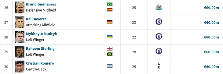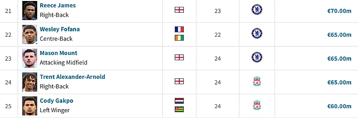 Между 21 и 30 местами – сразу 6 игроков «Челси».