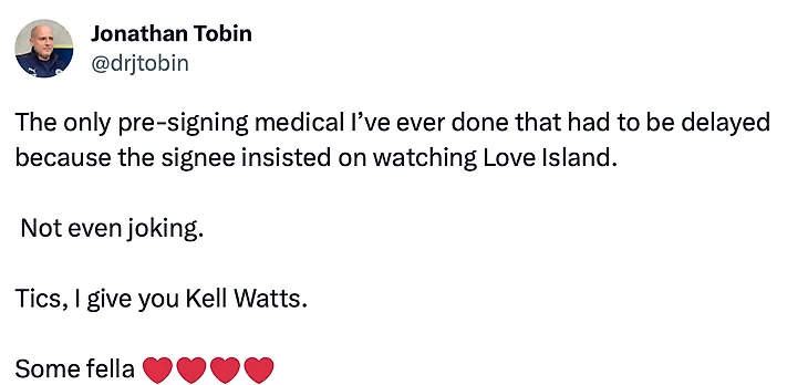 «Единственное медицинское обследование перед подписанием контракта, которое я когда-либо делал, пришлось отложить, потому что игрок настоял на просмотре «Острова любви». Это даже не шутка», – написал врач.