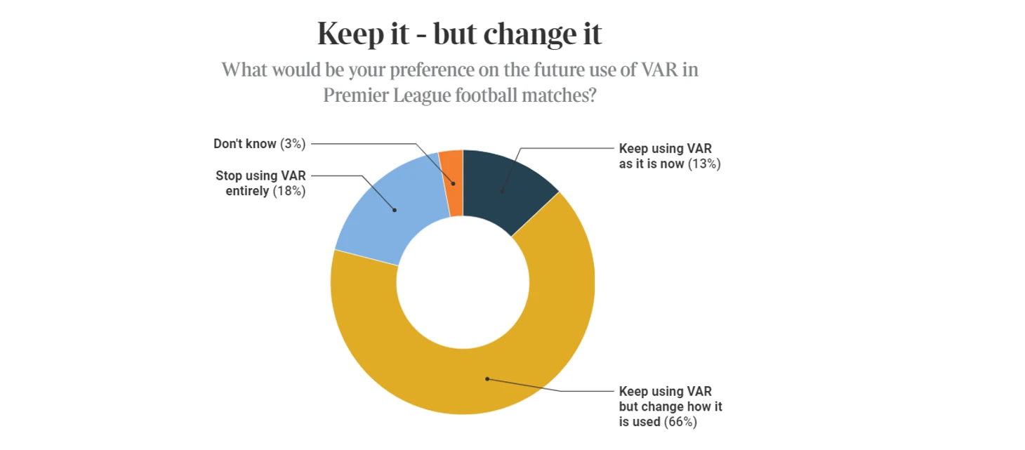Издание The Times провело эксклюзивный опрос, который показал, что более трех четвертей респондентов, интересующихся футболом, хотят оставить VAR, но большинство желают увидеть изменения в системе. Только 18% человек прямо сейчас бы отказались от технологии.