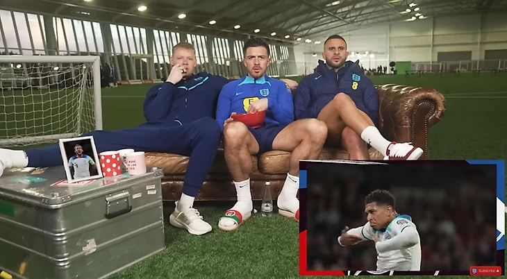 Официальный Youtube-канал сборной Англии выложил видео, на котором игроки «Манчестер Сити» Кайл Уокер и Джек Грилиш в компании вратаря «Арсенала» Аарона Рэмсдейла просматривали лучшие моменты с тренировок команды 2023 года. Парни не забыли даже взять попкорн, а диван им предоставили.