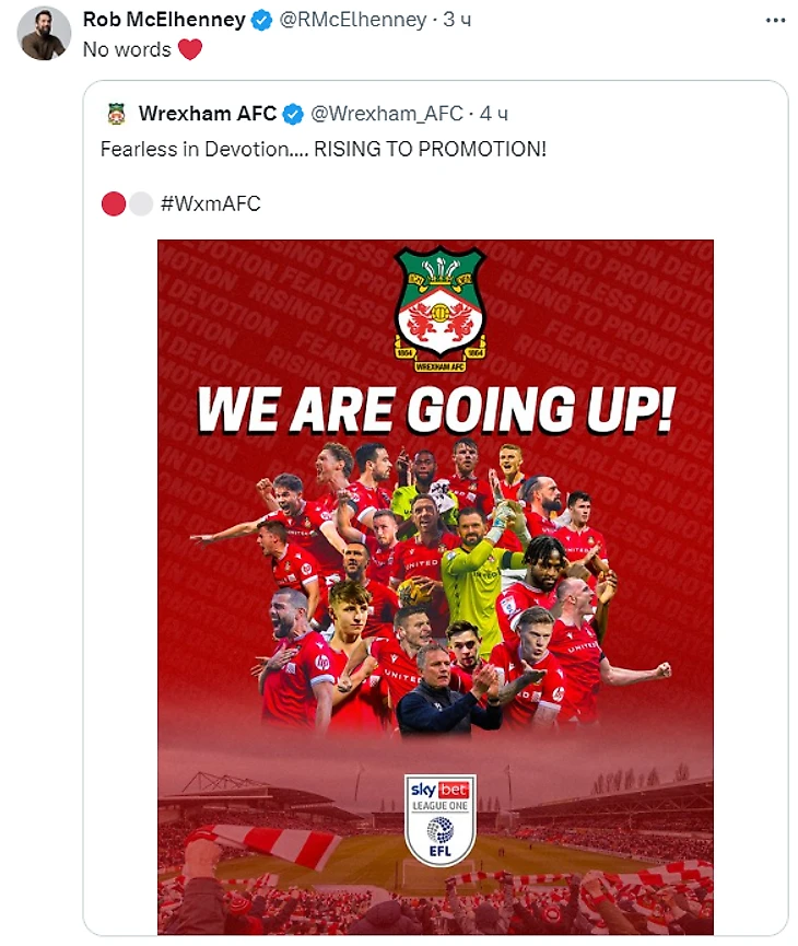 А вот Рейнольдс написал больше слов и явно был тронут: «Если бы вы несколько лет назад сказали мне, что я буду плакать от радости по поводу футбольного матча, проходящего в Северном Уэльсе, вы были бы Робом МакЭлхенни. Поздравляю «Рексхем» и моего сопредседателя по преступлению (игра слов: соучастника преступления). Заполните город! Это путешествие всей нашей жизни».