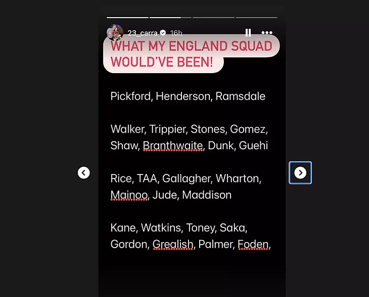 Джейми Каррагер не во всем согласился с Гаретом и в сториз выложил свой список из 26 игроков. Он не вернул в него ни Кертиса Джонса, ни Джаррела Куансу, но при этом поставил Брэнтуэйта, Мэддисона и Грилиша.