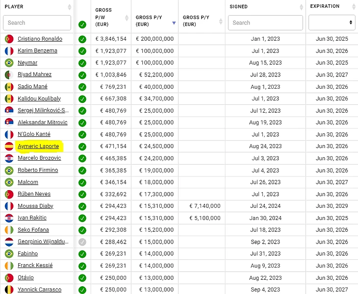 Кажется, что это солидная сумма, тем более, что в Англии форвард зарабатывает ровно в двадцать раз меньше. Однако 20 млн евро в год в Саудовской Аравии − это даже не топ-10. Десятку замыкает защитник «Аль-Насра» Эмерик Лапорт − у него 24,5 млн евро в год.