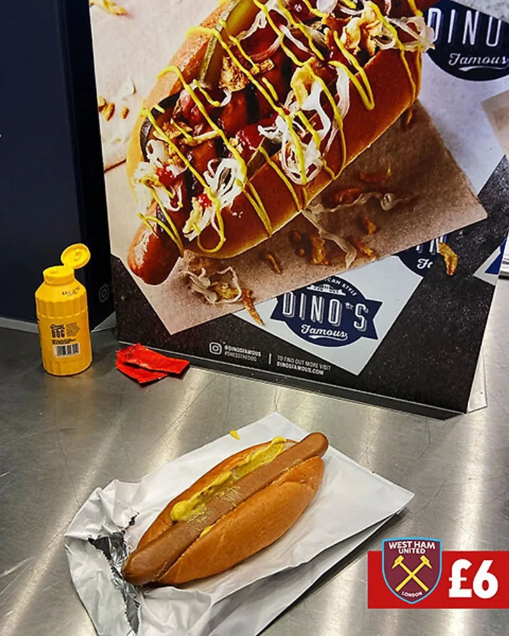 Обычно на английских стадионах можно найти фиш-энд-чипс, пиво, панини, пиццу, бургеры, пироги и, конечно же, хот-доги. Наш герой решил взять именно «горячую собаку» и каково было удивление, когда вместо булочки с сосиской ему дали... вот эту вот булочку с сосиской. Причем за 4,5 фунта!