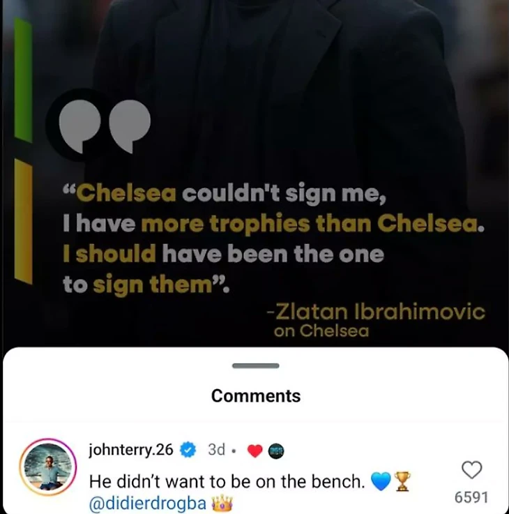 Джон Терри решил подколоть Златана Ибрагимовича, наткнувшись на цитату экс-форварда «Юве», «Интера», «Милана», «МЮ», «ПСЖ» и других команд, объясняющую, почему он так и не перешел в «Челси» за свою карьеру.