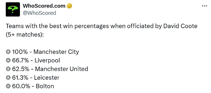Поклонники мерсисайдцев сразу вспомнили вагон ошибок Кута в матчах с участием их любимой команды. Как оказалось, статистически «красные» не так сильно страдали от действий арбитра. Более того, в играх, на которых работал Дэвид, «Ливерпуль» показывал неплохие результаты