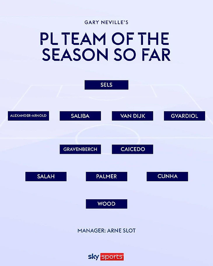 Невилл дополнил свою команду лучших игроков первой половины сезона так: Трент Александер-Арнолд («Ливерпуль»), Вильям Салиба («Арсенал»), Йошко Гвардиол («Ман Сити») и Матц Зельс («Ноттингем Форест»).
