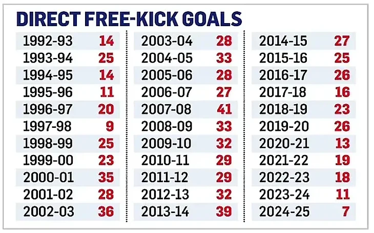 Тенденция к сокращению ударов очевидна. Например, «Арсенал» с прошлого сезона исполнил только восемь прямых ударов из 128 штрафных в финальной трети поля, а их последний гол прямым ударом был в 2021 году.