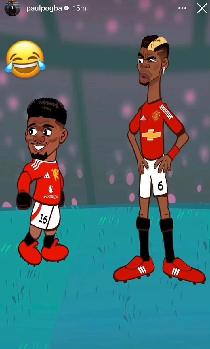 Поль выложил две сторис. Одна – скрин из мультяшного видео, где изображен он и Амад Диалло в форме «МЮ».