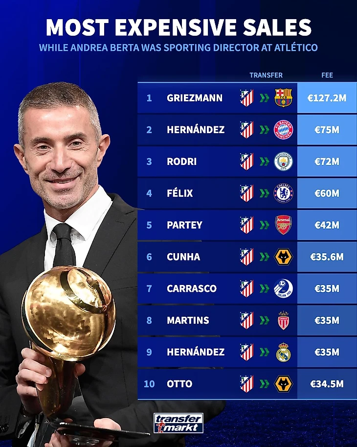 Самой выгодной продажей «Атлетико» при итальянце стал уход Антуана Гризманна в «Барселону», за француза в Мадрид из Каталонии перечислили 127,2 млн евро. На втором месте расположился переход Люки Эрнандеса в «Баварию», защитник обошелся мюнхенцам в 75 млн евро. Выделяется уход Родри, занявший третью строчку рейтинга, за последнего обладателя «Золотого мяча» «Ман Сити» заплатил 72 млн евро.