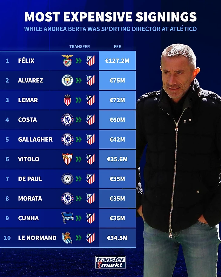 Transfermarkt прошелся по трансферам «Атлетико», когда спортдиром команды был Берта. Самым дорогим подписанием «матрасников» стал Жоау Феликс, за португальца столичный клуб заплатил «Бенфике» чуть больше 127 млн евро. Нынешний лидер «Атлетико», Хулиан Альварес, обошелся команде в 75 млн евро – это вторая строчка рейтинга.