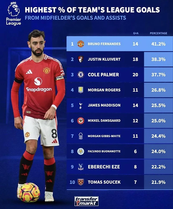 Хавбеки АПЛ с наибольшим процентом голов и передач от общего командного количества. В лидерах − игрок «МЮ»