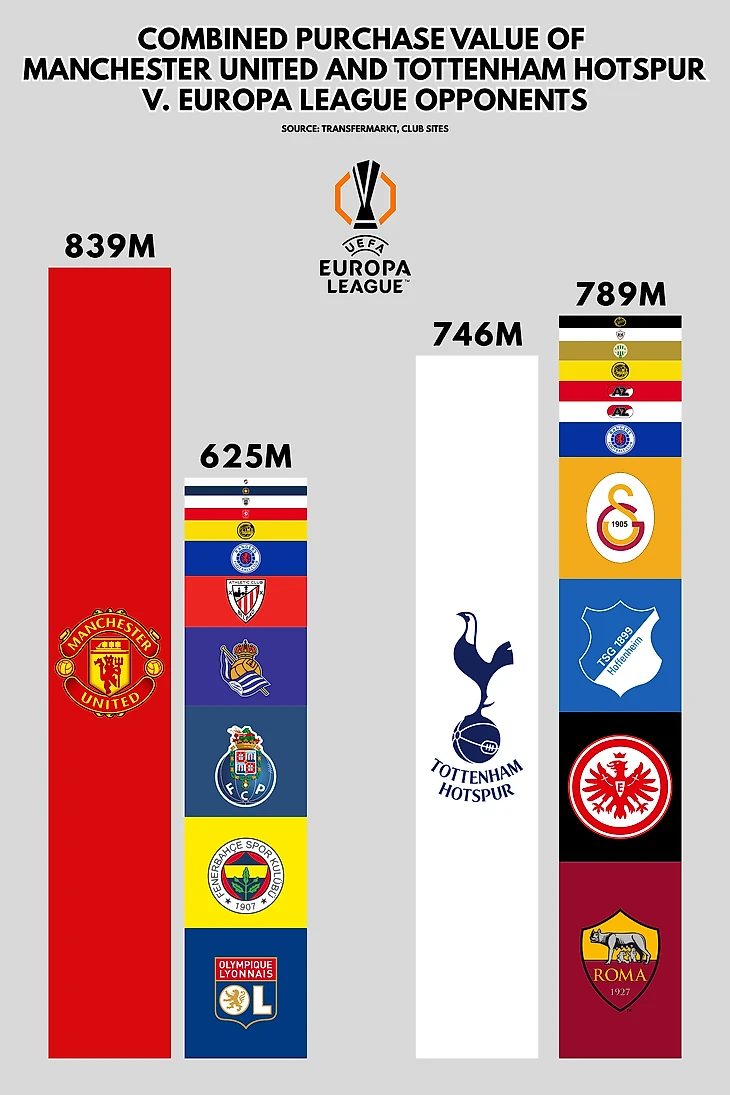 Сегодня в Бильбао «Манчестер Юнайтед» в финале Лиги Европы сыграет против «Тоттенхэма». Незадолго до матча на Reddit показали интересную инфографику. На ней сравнили стоимость составов соперников этих двух клубов, которые противостояли им в еврокубковом сезоне. Использовали данные Transfermarkt и официальных сайтов.