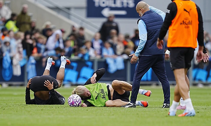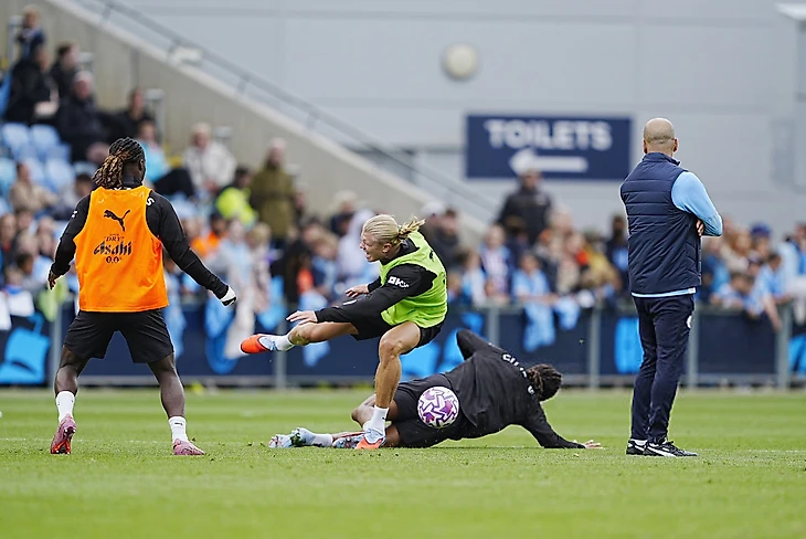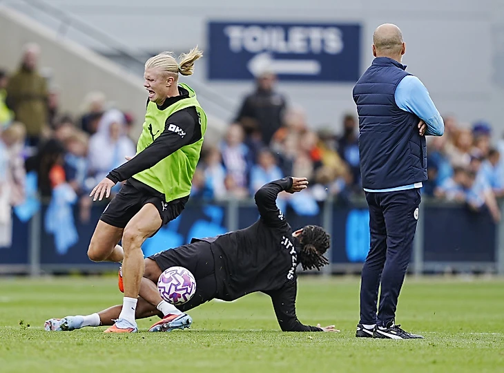 Убедившись, что Эрлинг жив, Пеп несколько раз показал Натану воображаемую красную. С Холандом все хорошо, они с Аке обнялись и дружно продолжили тренировку.