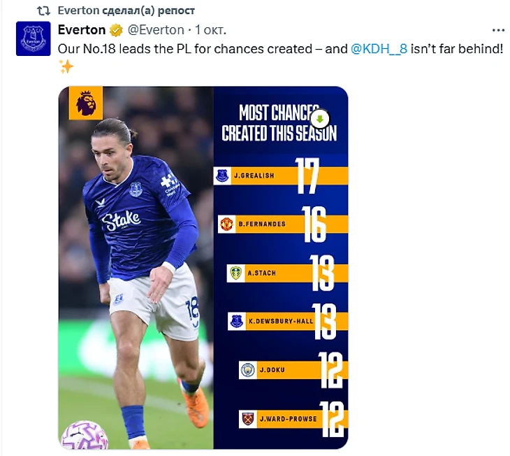 После того, как Джек Грилиш и его клуб узнали, что хавбека не вызвали в сборную, «Эвертон» репостнул картинку, на которой англичанин лидирует по количеству созданных моментов.